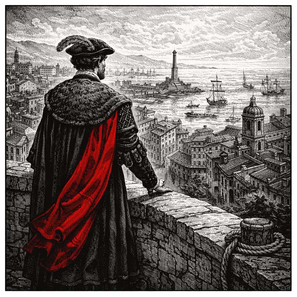 Abituato al cielo limpido dell’Andalusia, Fadrique rimane colpito dall’architettura severa e verticale della città. Era giunto a Genova con intenzioni molto concrete: desiderava accordarsi con i celebri scultori locali per la realizzazione delle tombe di famiglia.