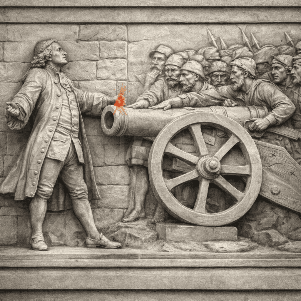 Un aristocratico davanti ai cannoni e una folla pronta all’assalto: in un bassorilievo si nasconde uno degli episodi più tesi della Genova settecentesca.