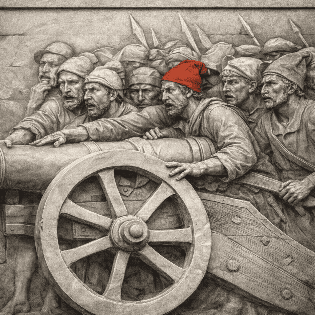Ma osservando attentamente il bassorilievo, emerge un dettaglio significativo. Le vesti dei popolani che minacciano Lomellini non sono settecentesche. Richiamano, con evidente anacronismo, quelle dei rivoluzionari giacobini: berretto frigio, feluche, atteggiamenti tipici dell’iconografia rivoluzionaria francese.
